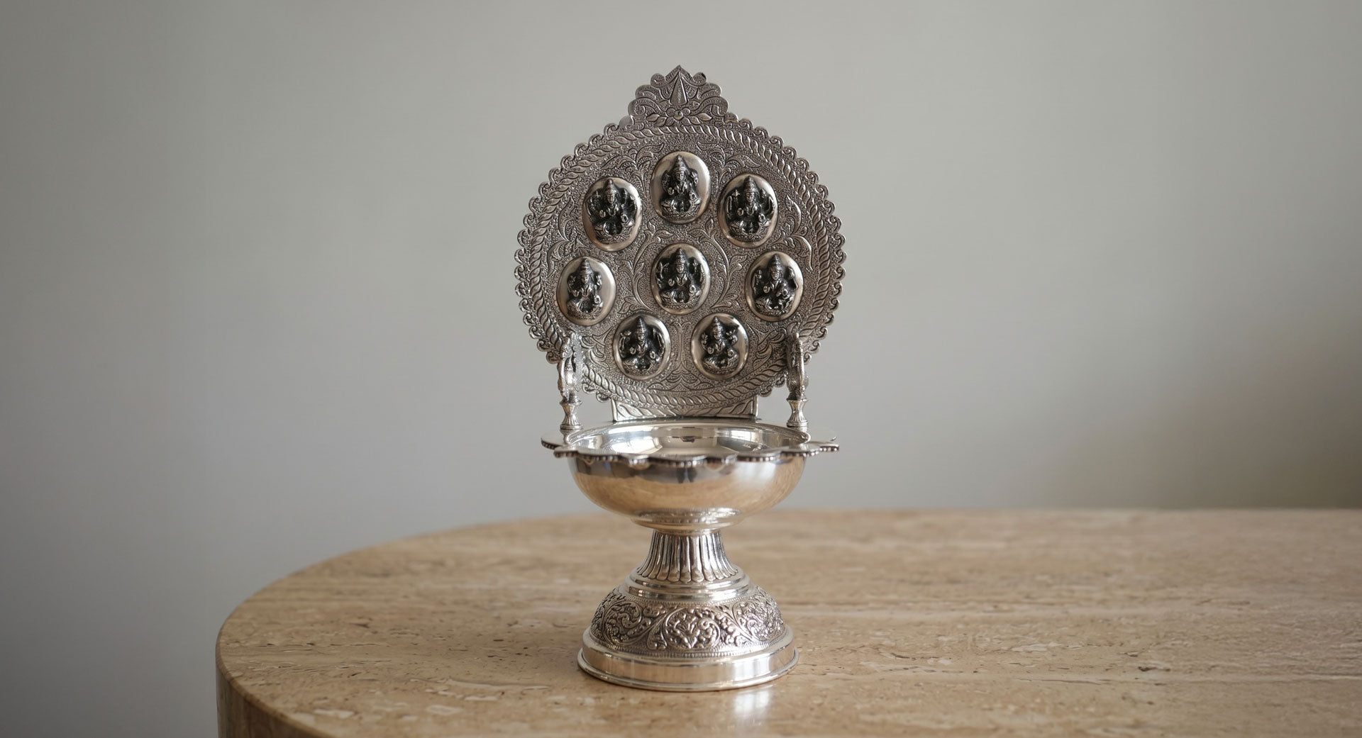 The Silver Asht Lakshmi is a handcrafted spiritual décor piece representing the eight forms of Goddess Lakshmi. Combining intricate artistry with sacred symbolism, it brings prosperity, harmony, and divine elegance into any space