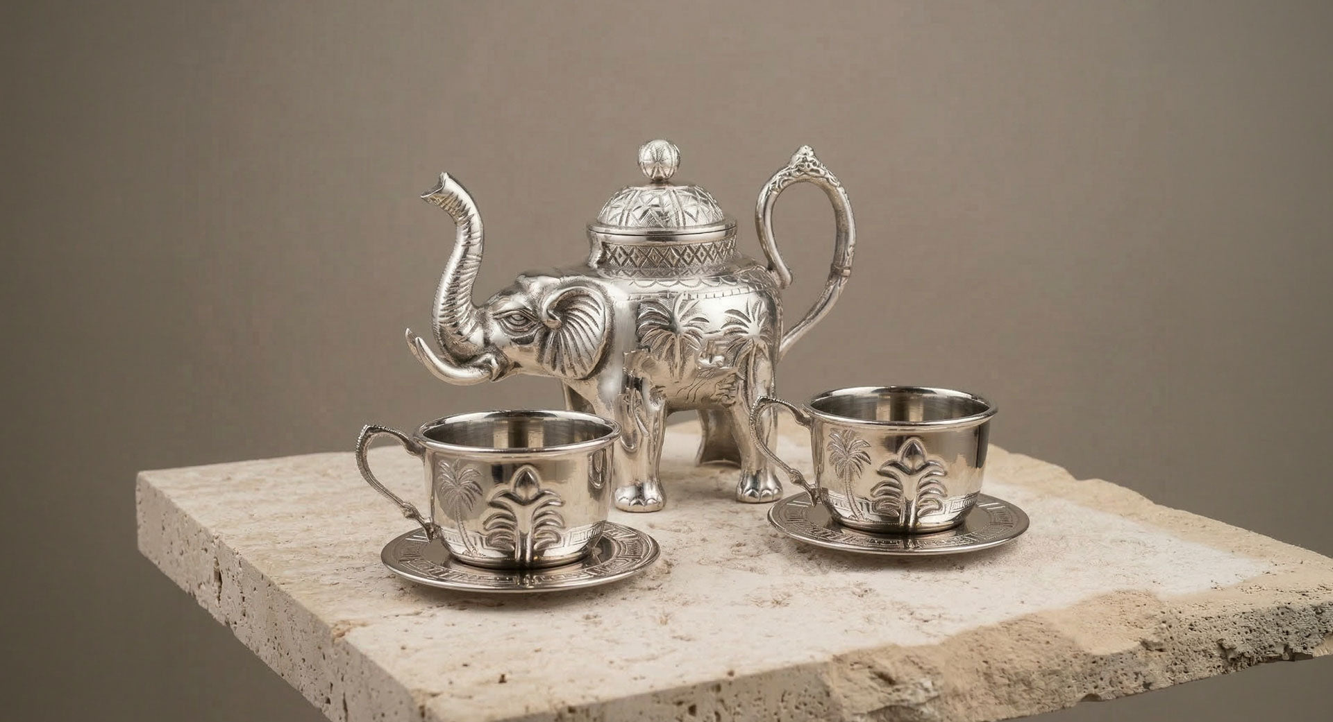 More than serveware, the Silver Elephant Kettle Set is a sculptural experience. Its distinctive elephant-inspired form paired with detailed engraving creates a presence that elevates both modern and traditional tables, making it as much a décor piece as it is functional.