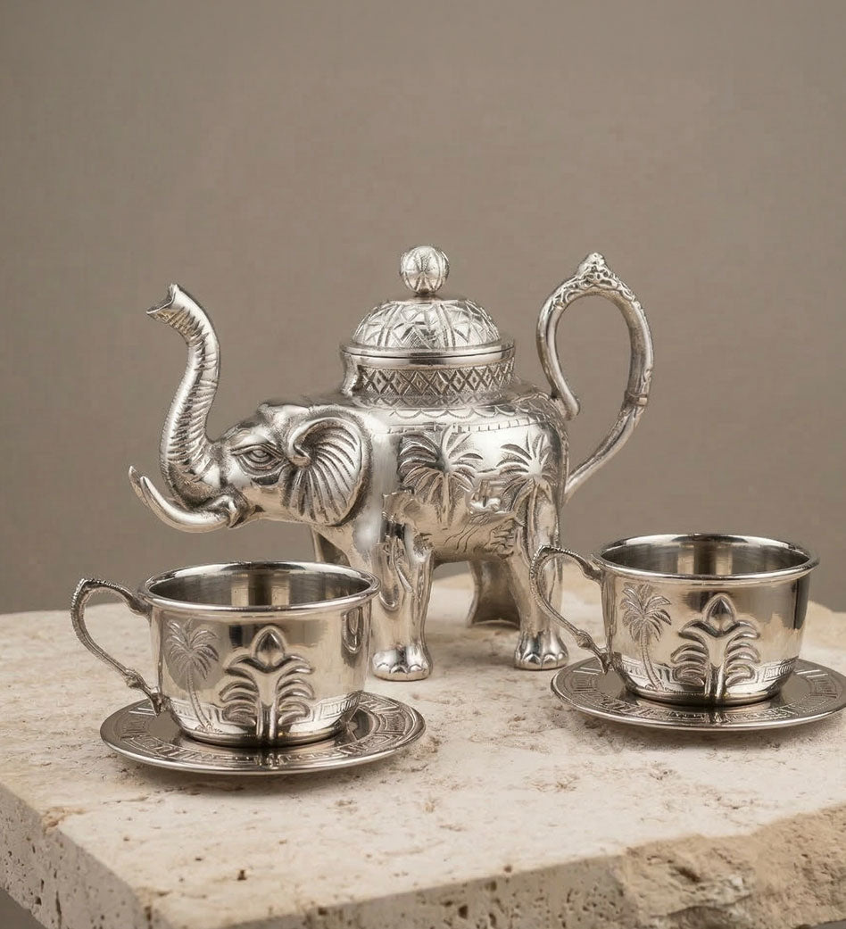 The Silver Elephant Kettle Set is a handcrafted serveware ensemble featuring a distinctive elephant-inspired design with intricate engraved detailing. Finished in a refined silver tone, it blends artistic craftsmanship with functional elegance, making it a standout piece for both serving and décor.