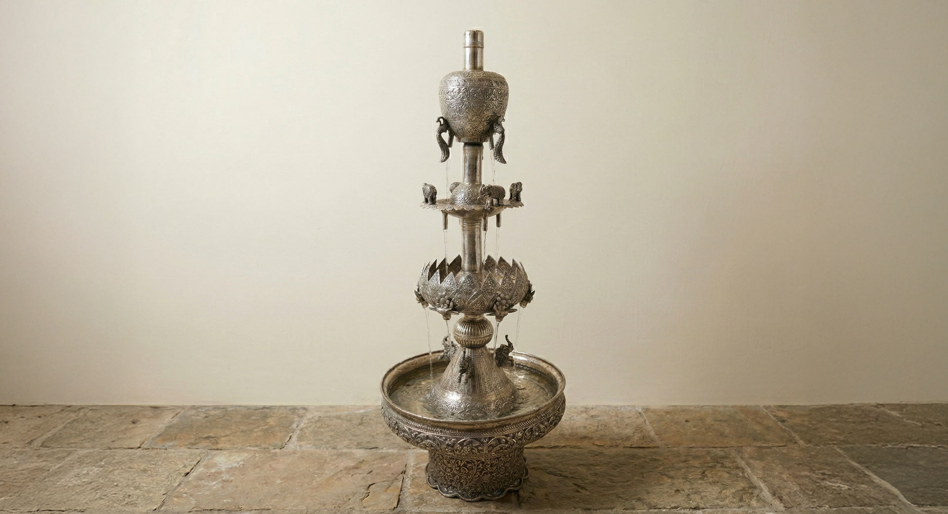 The Silver Fountain is a handcrafted multi-tier water feature that combines intricate detailing with a calming flow. Designed as both décor and experience, it adds serenity, movement, and timeless elegance to any space.e.